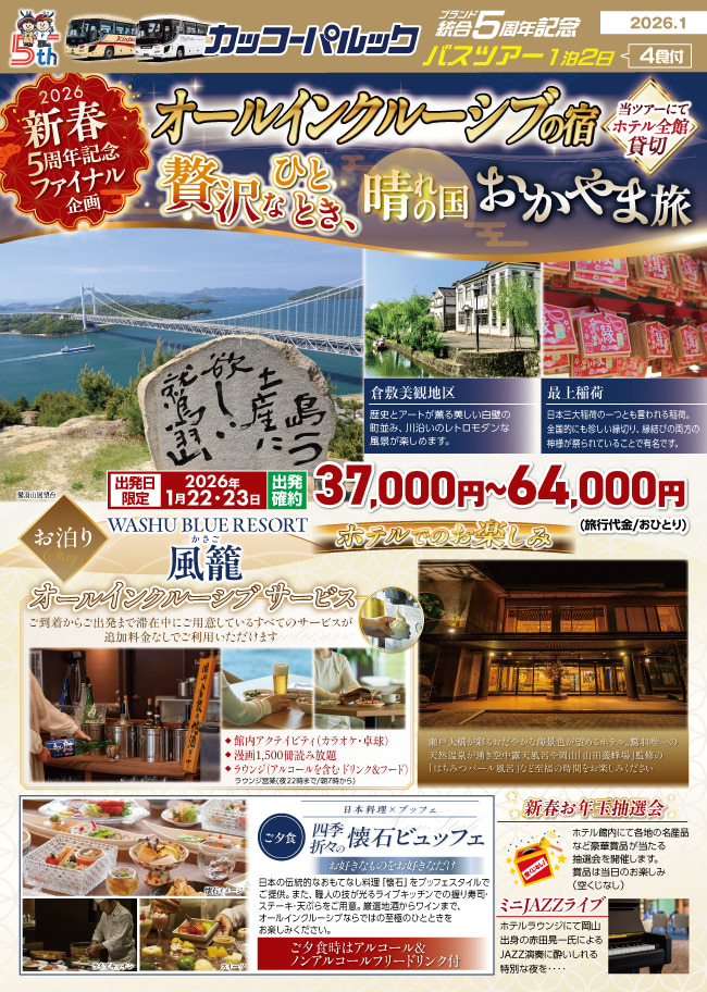 - 2025/10/10 オールインクルーシブのお宿で過ごす新春お年玉!瀬戸内倉敷1泊2日