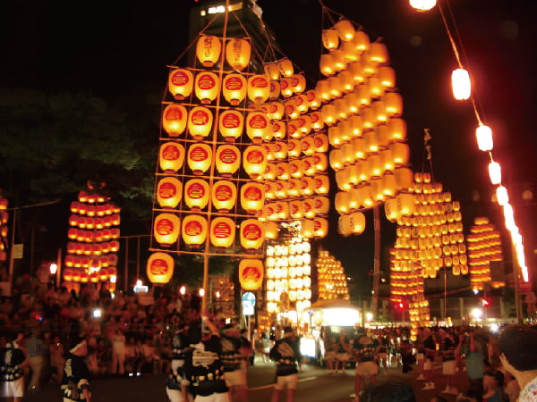 長い竿を十文字に構えて多くの提灯を取りつけ、「ドッコイショー、ドッコイショー」の掛け声や太鼓とともに街を練り歩きます。竿燈全体を稲穂に、連なる提灯を米俵に見立て、五穀豊穣を祈ります。250年以上の歴史を持つ国の重要無形民俗文化財です。 -