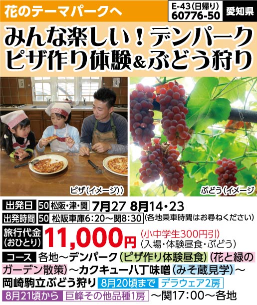 | 60776-50 | 日帰りバスの旅 | 11,000円 ~ 11,000円 | 2024/07/27 ~ 2024/08/23 |