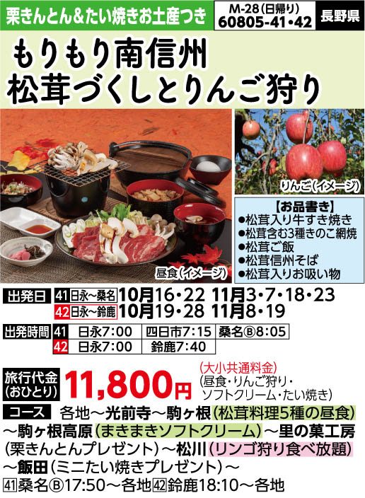 ・松茸牛すき焼・焼ききのこ(松茸含む3種)・松茸御飯・松茸信州そば・松茸お吸い物