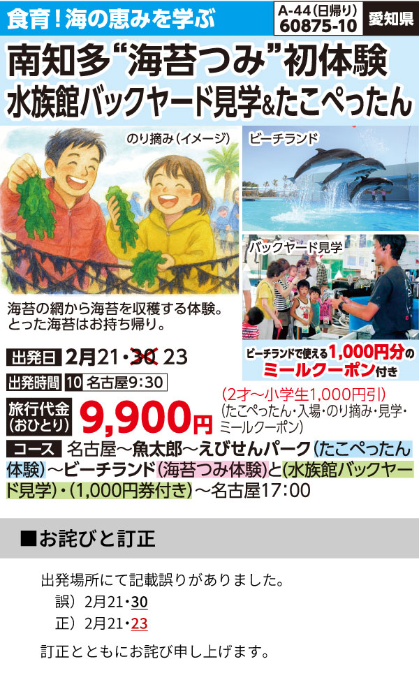 | 60875-10 | 日帰りバスの旅 | 9,900円 ~ 9,900円 | 2026/02/21 ~ 2026/02/23 |