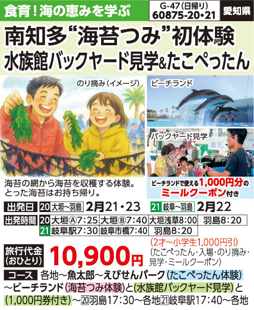 【海苔つみ体験と水族館バックヤード見学】&【食事やお土産に使える1,000円券付き】