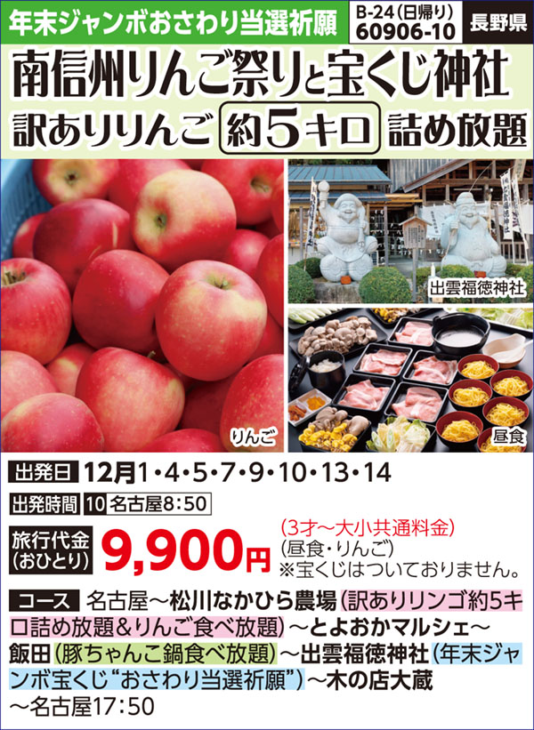 60906-10 | 日帰りバスの旅 | 9,900円 ~ 9,900円 | 2025/12/01 ~ 2025/12/14 |
