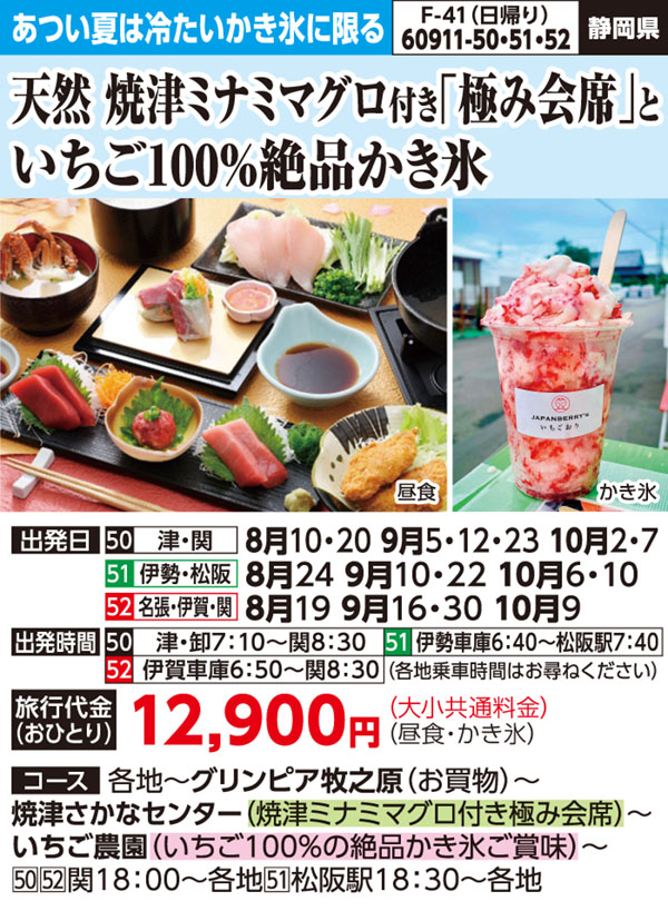 | 60911-51 | 日帰りバスの旅 | 12,900円 ~ 12,900円 | 2025/07/21 ~ 2025/10/10 |