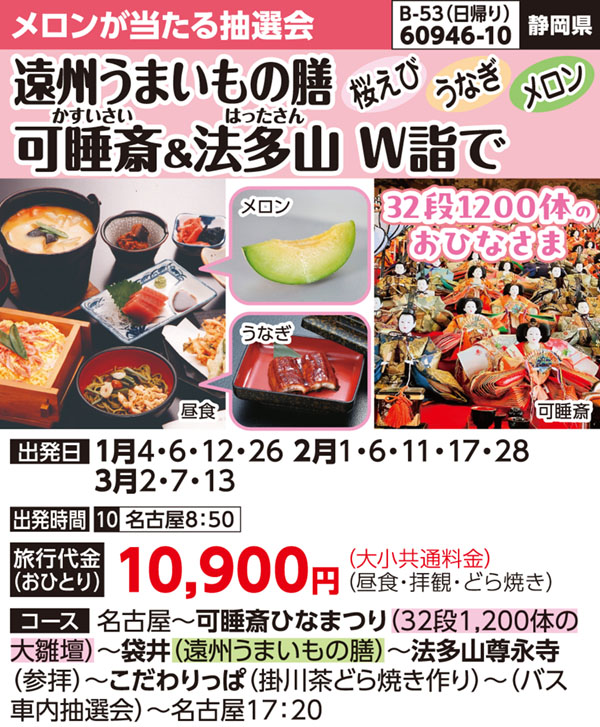 60946-10 | 日帰りバスの旅 | 10,900円 ~ 10,900円 | 2026/01/04 ~ 2026/03/13 |