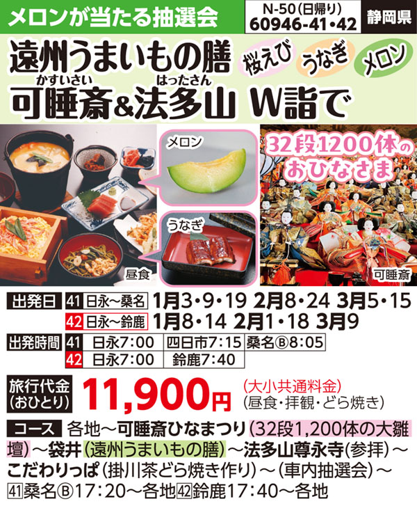 60946-42 日帰りバスの旅 11,900円 ~ 11,900円 2026/01/08 ~ 2026/03/09