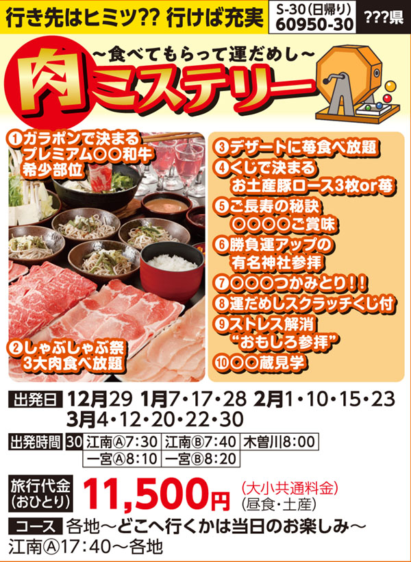 | 60950-30 | 日帰りバスの旅 | 11,500円 ~ 11,500円 | 2025/12/29 ~ 2026/03/30 |