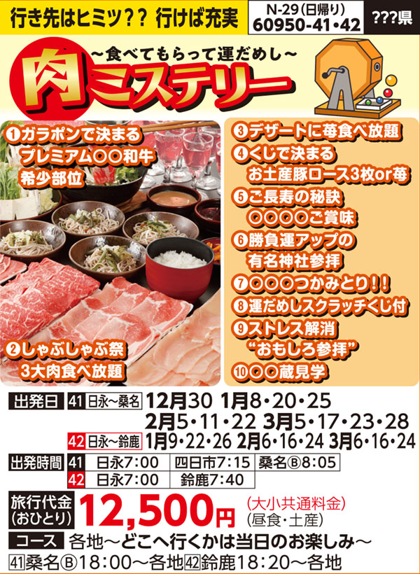 | 60950-41 | 日帰りバスの旅 | 12,500円 ~ 12,500円 | 2025/12/30 ~ 2026/03/28 |