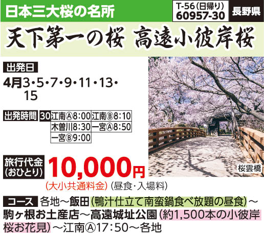 | 60957-30 | 日帰りバスの旅 | 10,000円 ~ 10,000円 | 2026/04/03 ~ 2026/04/15 |