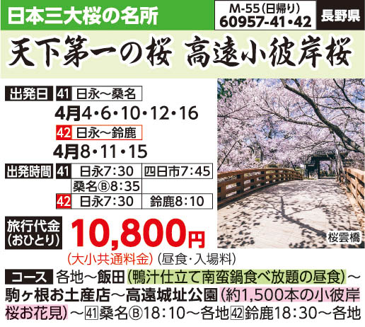 | 60957-41 | 日帰りバスの旅 | 10,800円 ~ 10,800円 | 2026/04/04 ~ 2026/04/16 |