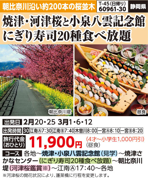 (※1)河津桜の開花状況により、蓬莱橋に行程を変更します。