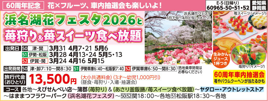 | 60965-50 | 日帰りバスの旅 | 13,500円 ~ 13,500円 | 2026/03/31 ~ 2026/05/06 |