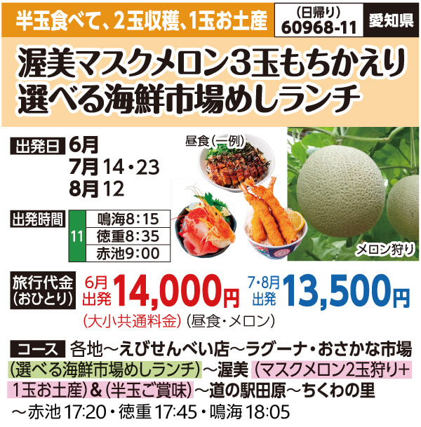 | 60968-11 | 日帰りバスの旅 | 13,500円 ~ 14,000円 | 2026/06/29 ~ 2026/08/12 |