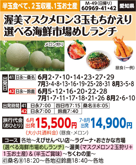 | 60969-41 | 日帰りバスの旅 | 14,900円 ~ 15,500円 | 2026/06/02 ~ 2026/08/08 |