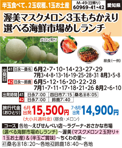 | 60969-42 | 日帰りバスの旅 | 14,900円 ~ 15,500円 | 2026/06/05 ~ 2026/08/10 |