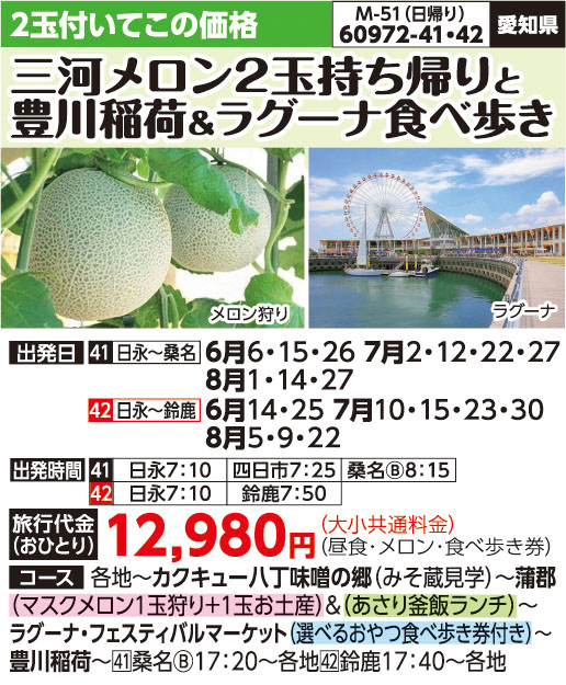 60972-42 日帰りバスの旅 12,980円 ~ 12,980円 2026/06/14 ~ 2026/08/22