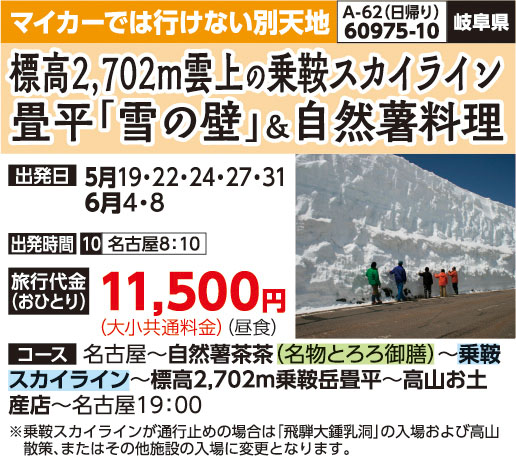 ※旅行当日、乗鞍スカイラインが通行止めの場合は「飛騨大鍾乳洞」の入場および高山