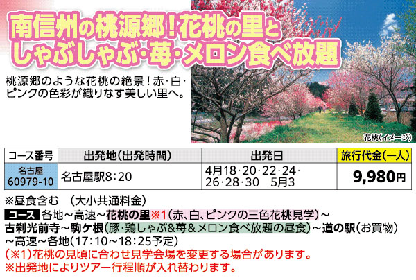 | 60979-10 | 日帰りバスの旅 | 9,980円 ~ 9,980円 | 2026/04/18 ~ 2026/05/03 |