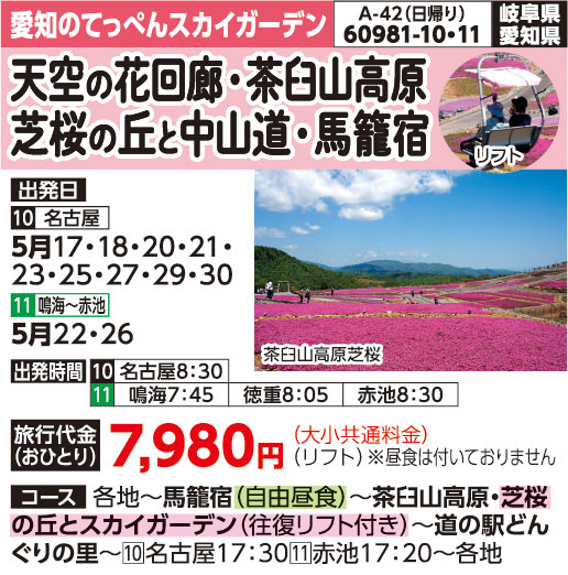 | 60981-11 | 日帰りバスの旅 | 7,980円 ~ 7,980円 | 2026/05/22 ~ 2026/05/26 |