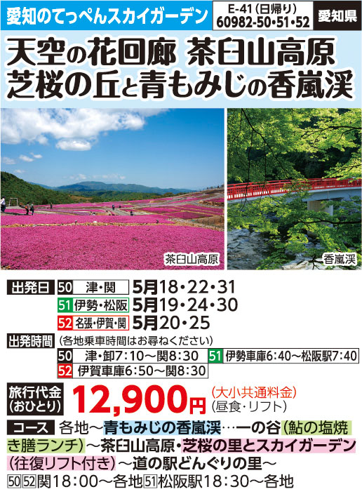 | 60982-50 | 日帰りバスの旅 | 12,900円 ~ 12,900円 | 2026/05/18 ~ 2026/05/31 |