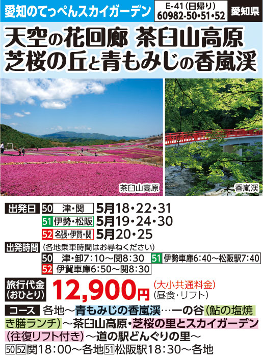 | 60982-51 | 日帰りバスの旅 | 12,900円 ~ 12,900円 | 2026/05/19 ~ 2026/05/30 |