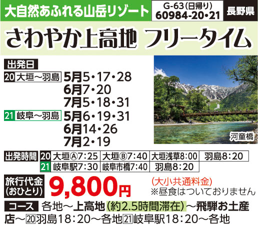 ※交通渋滞等により遅延が生じた場合、上高地での滞在時間を短縮する場合があります。