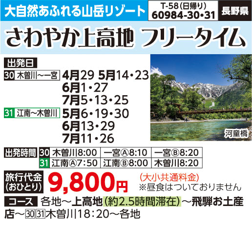 | 60984-31 | 日帰りバスの旅 | 9,800円 ~ 9,800円 | 2026/05/06 ~ 2026/07/26 |
