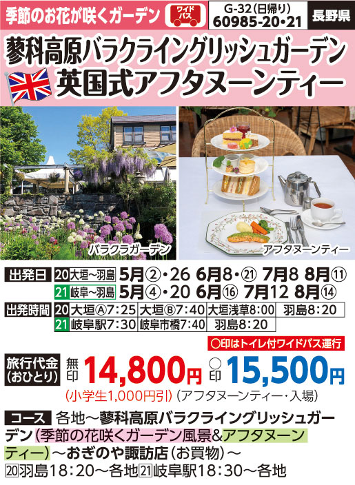 60985-21 日帰りバスの旅 14,800円 ~ 15,500円 2026/05/04 ~ 2026/08/14