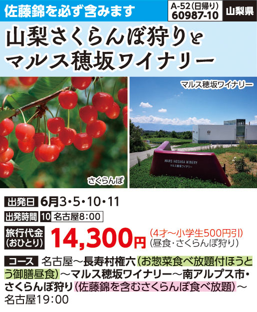 | 60987-10 | 日帰りバスの旅 | 14,300円 ~ 14,300円 | 2026/06/03 ~ 2026/06/11 |