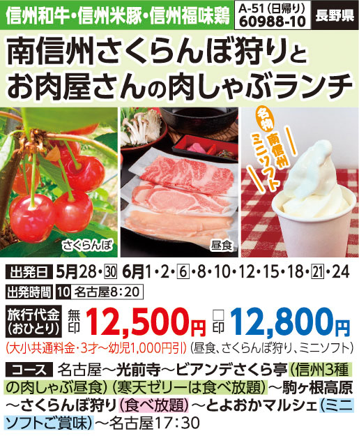 ――★駒ヶ根高原散策(約30分)―――★南信州さくらんぼ狩り【食べ放題30分】