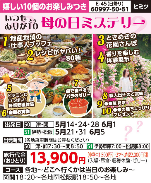 | 60997-51 | 日帰りバスの旅 | 13,900円 ~ 13,900円 | 2026/05/21 ~ 2026/06/05 |