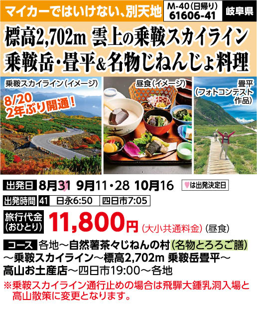 ※旅行当日、乗鞍スカイラインが通行止めの場合は「飛騨大鍾乳洞」の入場および高山