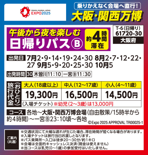 | 61720-30 | 日帰りバスの旅 | 19,300円 ~ 19,300円 | 2025/07/02 ~ 2025/10/05 |