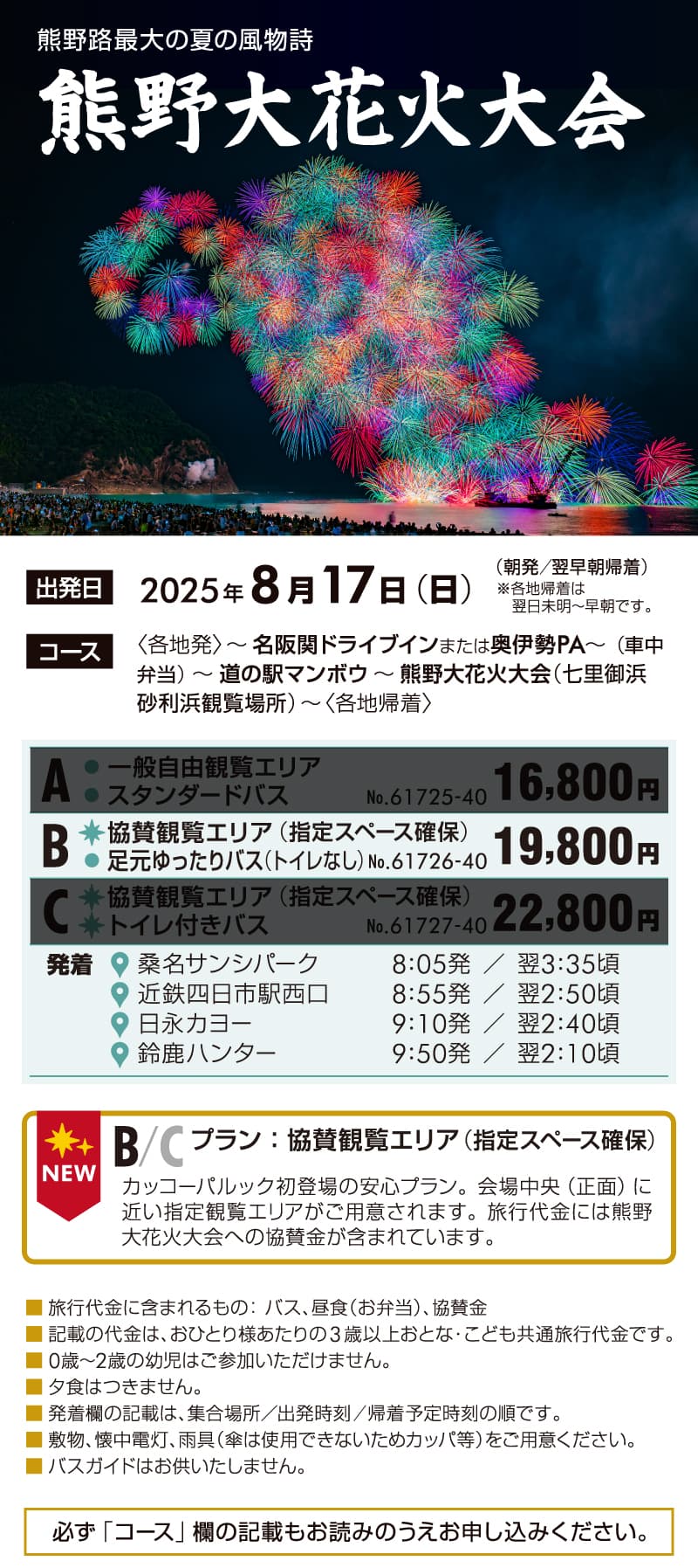カッコーパルック初登場の安心プラン!会場中央(正面)に近い指定観覧エリアがご用意されます。旅行代金には熊野大花火大会への協賛金が含まれています。