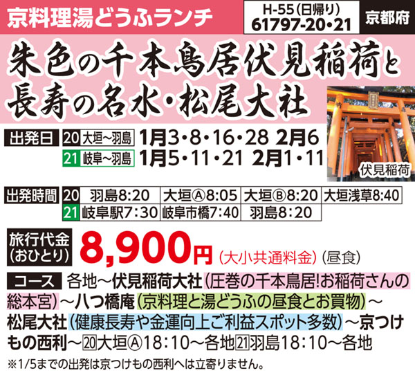 61797-20 | 日帰りバスの旅 | 8,900円 ~ 8,900円 | 2026/01/03 ~ 2026/02/06 |