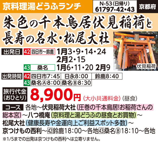 ※1月2日~1/7の出発は松尾大社まで片道約10分程の徒歩移動となります。