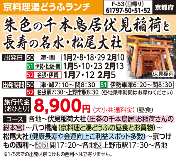 61797-50 | 日帰りバスの旅 | 8,900円 ~ 8,900円 | 2026/01/02 ~ 2026/02/10 |