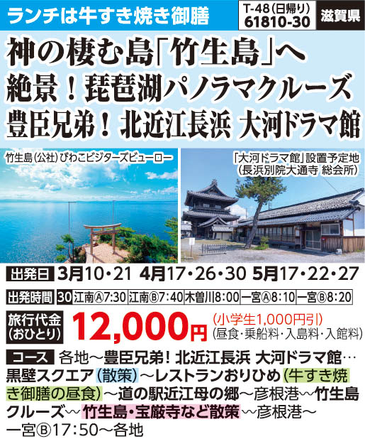 ※悪天候等によりクルーズが運休となった場合、団体乗船料金と竹生島入島料相当の