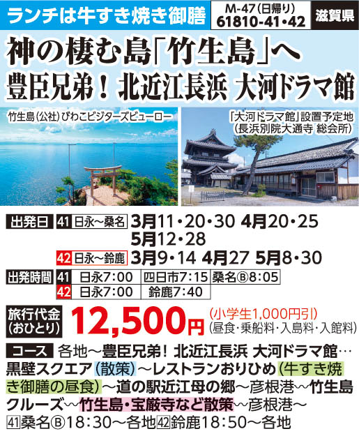 ※悪天候等によりクルーズが運休となった場合、団体乗船料金と竹生島入島料相当の