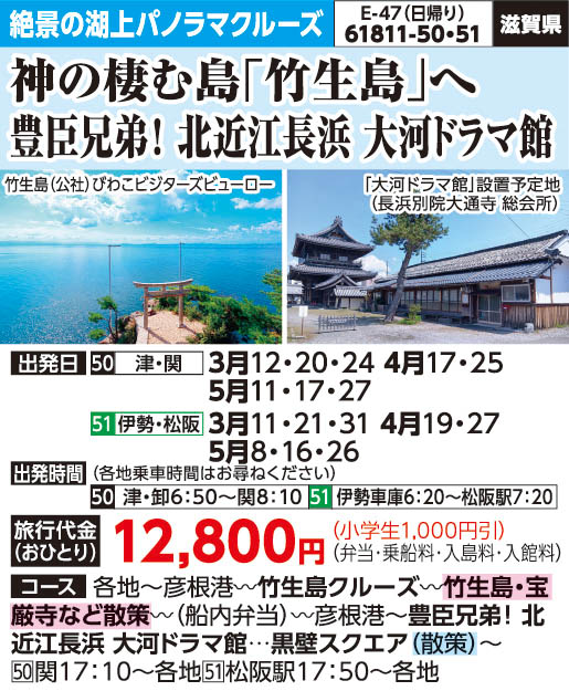 ※悪天候等によりクルーズが運休となった場合、団体乗船料金と竹生島入島料相当の