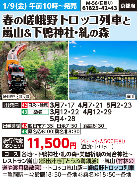 | 61825-42 | 日帰りバスの旅 | 11,500円 ~ 11,500円 | 2026/03/07 ~ 2026/05/23 |