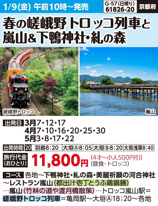 | 61826-20 | 日帰りバスの旅 | 11,800円 ~ 11,800円 | 2026/03/07 ~ 2026/05/22 |