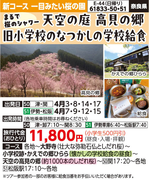 ※2 高見の郷のバス駐車場からしだれ桜見学まで徒歩約600Mの移動となります。