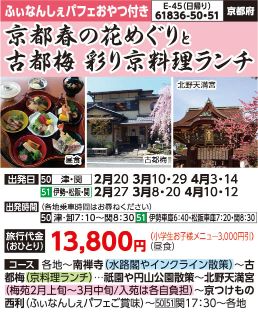 京都春の花めぐりと古都梅 彩り京料理ランチ