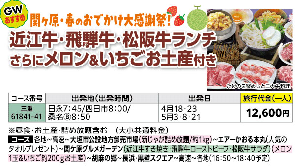 | 61841-41 | 日帰りバスの旅 | 12,600円 ~ 12,600円 | 2026/04/18 ~ 2026/05/21 |