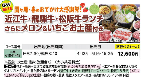 | 61841-42 | 日帰りバスの旅 | 12,600円 ~ 12,600円 | 2026/04/25 ~ 2026/05/26 |