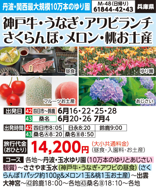 | 61844-42 | 日帰りバスの旅 | 14,200円 ~ 14,200円 | 2026/06/16 ~ 2026/06/28 |