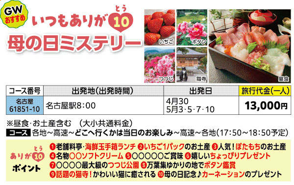 61851-10 日帰りバスの旅 13,000円 ~ 13,000円 2026/04/30 ~ 2026/05/10