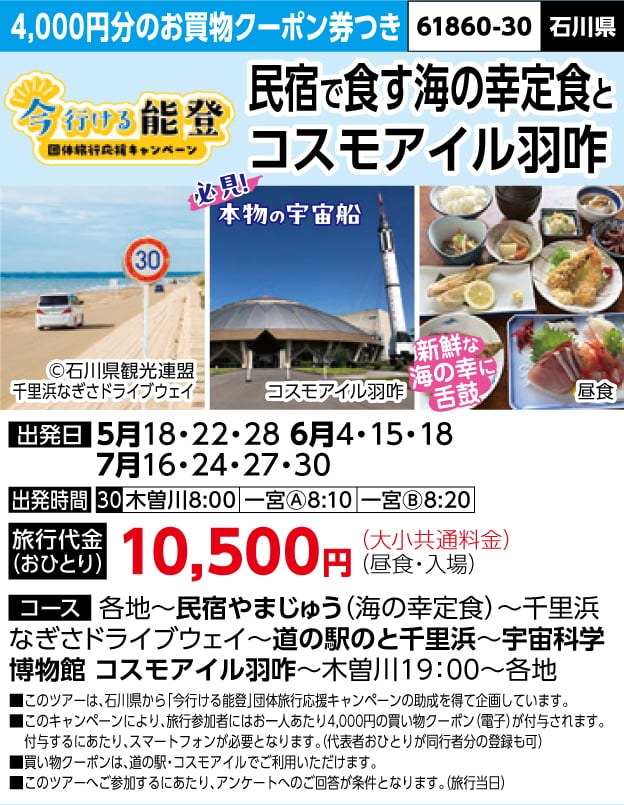 本旅行は、石川県から「今行ける能登」団体旅行応援キャンペーンの助成を得て企画しています。
