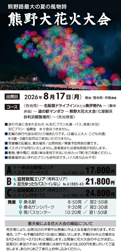 | 61885-43 | 日帰りバスの旅 | 21,800円 ~ 21,800円 | 2026/08/17 ~ 2026/08/17 |